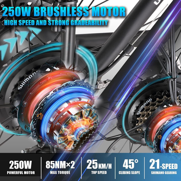 Zoom past obstacles with this super fun electric fat tire mountain bike! Its robust 26-inch wheels and anti-slip traction conquer any terrain, from sandy beaches to snowy trails. Enjoy extended adventures with the powerful 48V removable battery, offering over 70 miles of range. Plus, stay connected with the integrated USB charger and phone mount – adventure awaits! Wheel Size 26 inches Tire Type 4.0-inch Anti-Slip Fat Tyres Motor Power 48V High-Torque Brushless Motor (250W rear, dual-drive capable) Battery Removable 48V Battery Max Range 70+ miles Frame Material 6061 Aluminum Suspension System Dual Suspension with Gold Fork Shocks and Adjustable Fork Brake Type Dual Disc Brakes Headlight Integrated 2000-lumen LED Headlight Cargo Capacity Rear Rack, max 55 lbs Charging Port Built-in USB-C (5V/2A) Phone Mount Included, fits 4-7 inch screens, 360° rotation Assembly Level 85% Pre-assembled Number of Speeds 7 Color Black-and-Green